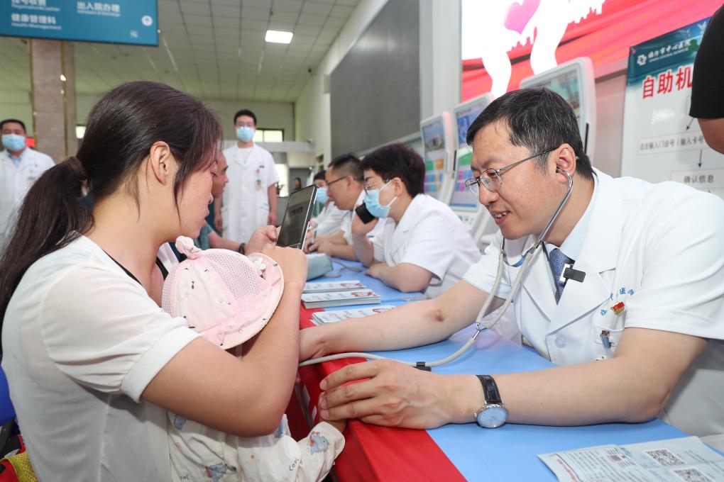 在臨汾市中心醫院,劉輝(右)在義診中為一名兒童檢查(2024年6月18日攝)。新華社記者 劉揚濤 攝