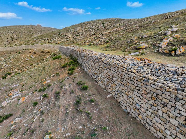 沿內蒙古包頭市石拐區一條山間縣道自西向東行駛,途經一處開闊的觀景區,便來到戰國趙北長城遺址附近。這段長城大致沿陰山南麓依山而建,蜿蜒起伏,墻體均為夯筑,夯土層次清晰,南側則是歷史上因水草肥美而聞名的土默川草原,也是古代兵家必爭之地。