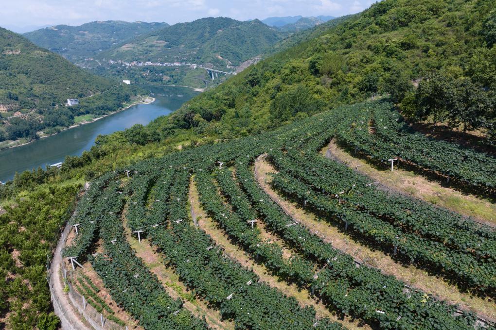 陜西省旬陽市構元鎮構元社區居民吳世銀在家鄉承包建設的精品葡萄園(7月4日攝)。新華社記者邵瑞 攝