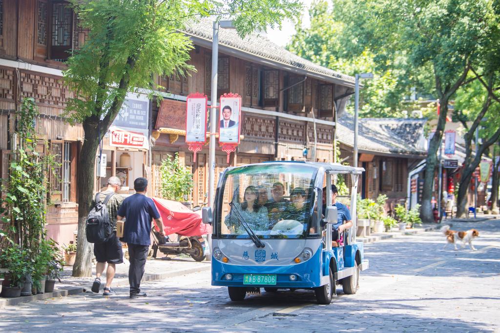 ↑7月10日,游客乘坐游覽車觀賞寧波慈城古縣城街景。