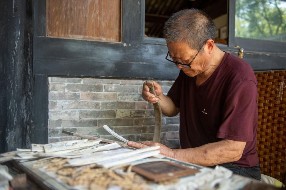 ↑7月10日,骨木鑲嵌技藝代表性傳承人甘金云在慈城古縣城的家中制作骨木鑲嵌工藝品。