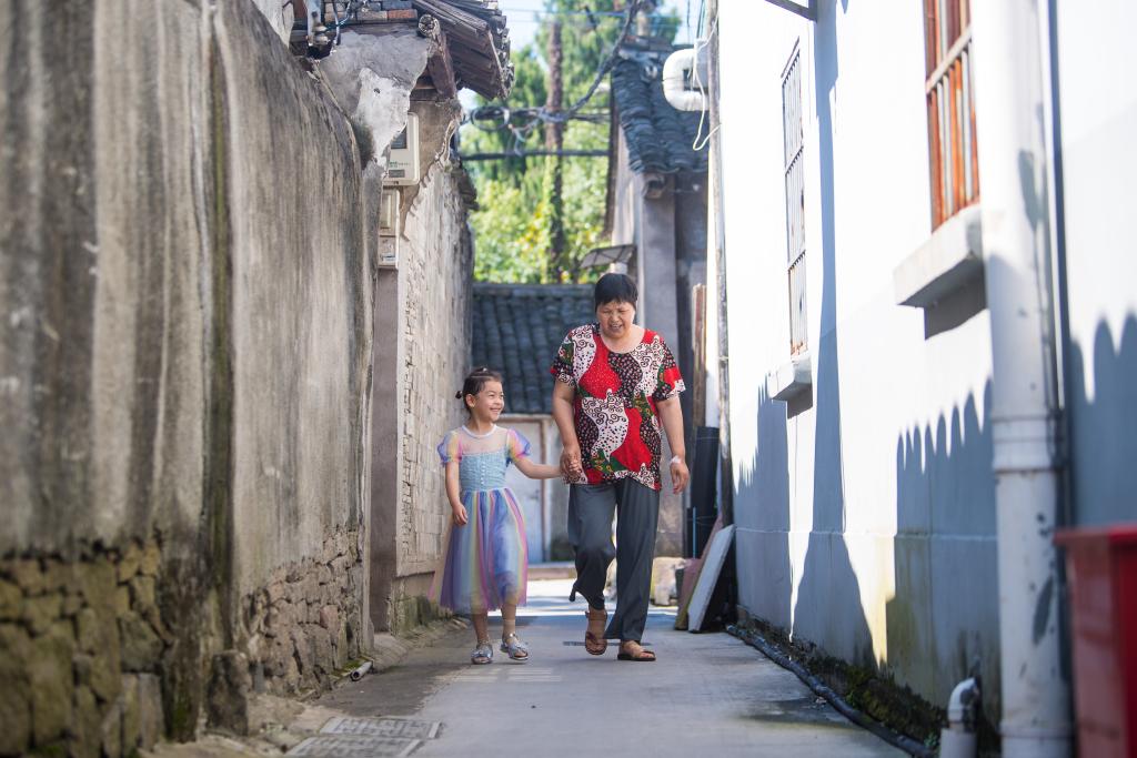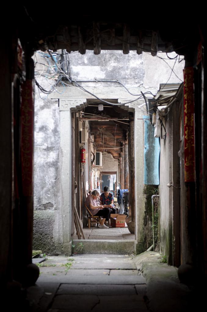 ↑7月10日,慈城居民陳桂芬(右)與孫女邱芮伊行走在古縣城的小巷內。