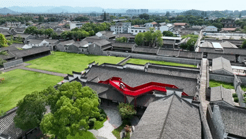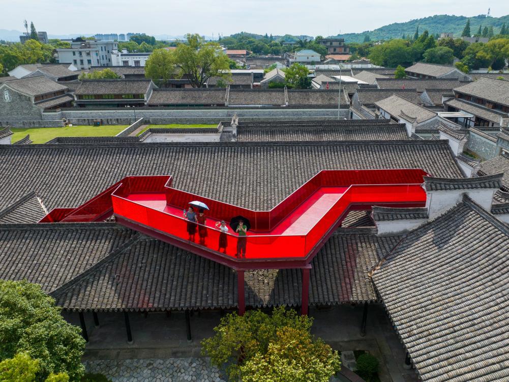 ↑7月9日,游客在寧波慈城古縣城內的周信芳戲劇藝術館參觀(無人機照片)。
