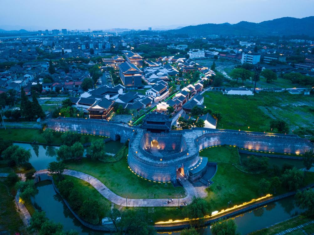 ↑這是寧波慈城古縣城大東門夜景(無人機照片,7月10日攝)。