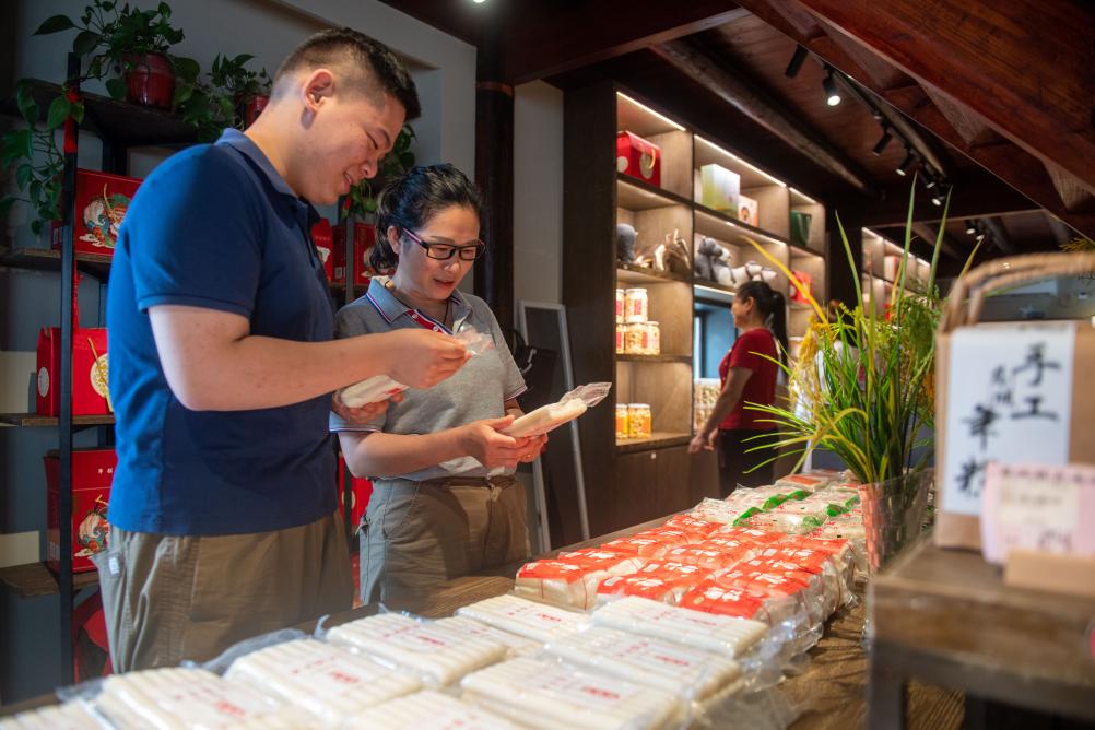 ↑7月9日,游客在寧波慈城古縣城商店內挑選年糕產品。年糕是慈城的特色物產之一。