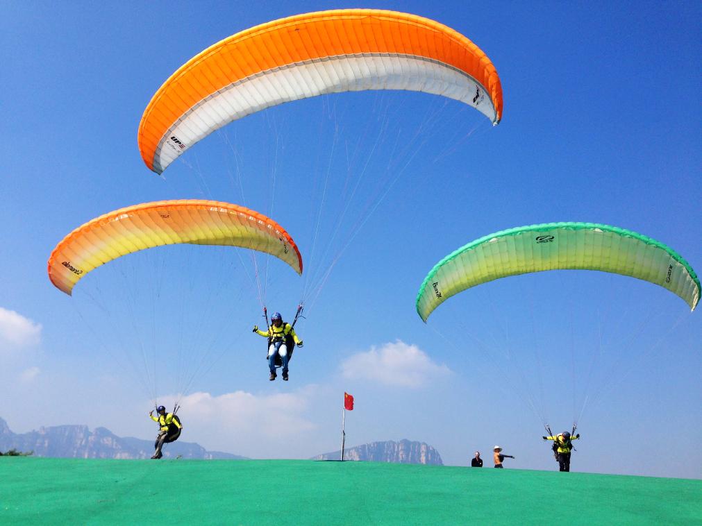 “天空懸廊好刺激,距離地面有400多米,站上去雖然有點害怕,但景色壯觀!值得來體驗?!眲倧奶炜諔依认聛淼膹埾壬拥卣f。不只是天空懸廊,大峽谷東側崖壁之上的滑翔教場也充滿挑戰,滑翔愛好者在這里開傘、轉身、助跑……享受著一次又一次與自然最純粹的親密接觸。