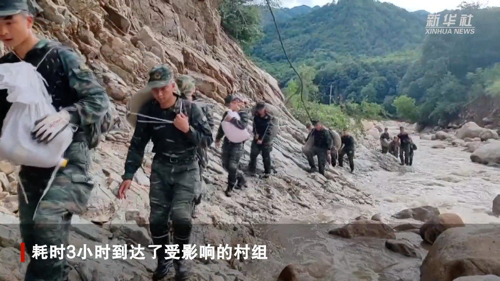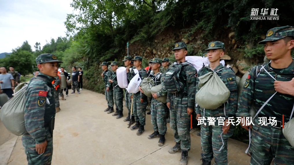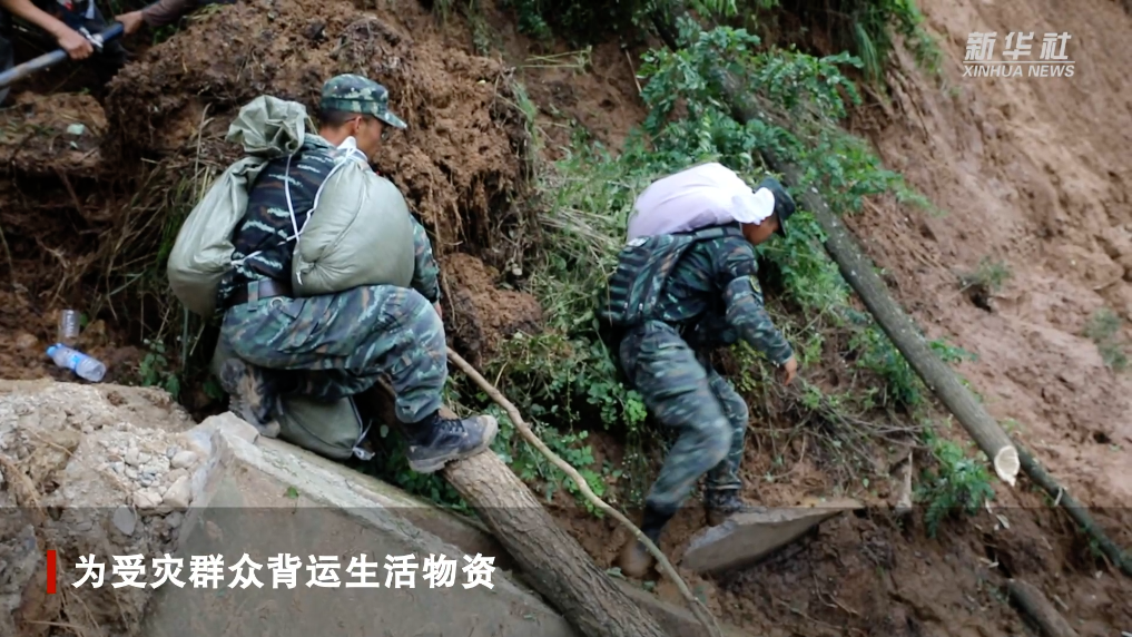 在平木鎮劉家莊村,因為通訊和電力中斷,來自武警寶雞支隊的20多名武警官兵肩扛背馱,一路跋山涉水,來回耗時6個小時,將米、面、油、被褥等生活必需品送到偏遠村組。