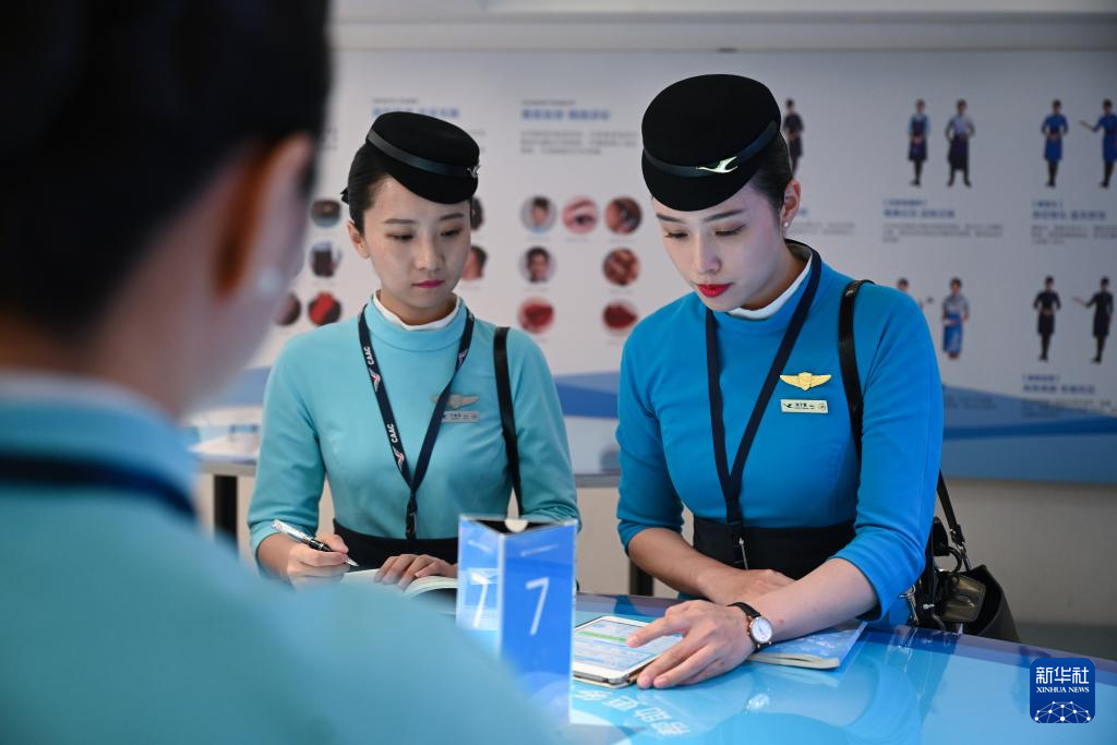 7月18日,陳于萱(右一)和同事在廈門航空乘務運行中心做航前準備工作。新華社記者 周義 攝