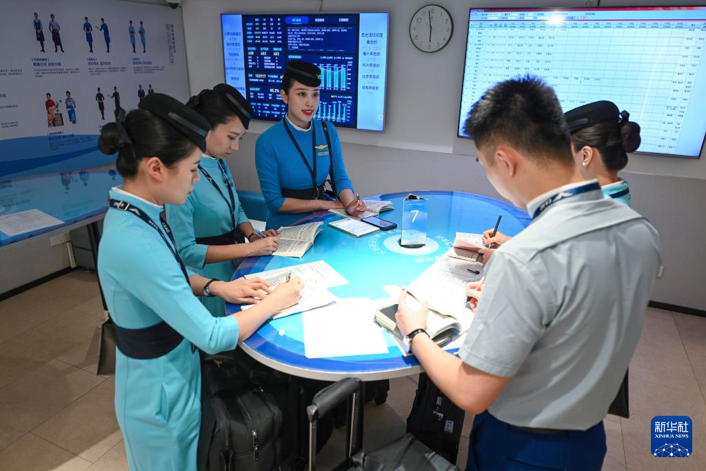 7月18日,陳于萱(左三)和同事在廈門航空乘務運行中心做航前準備工作。新華社記者 周義 攝