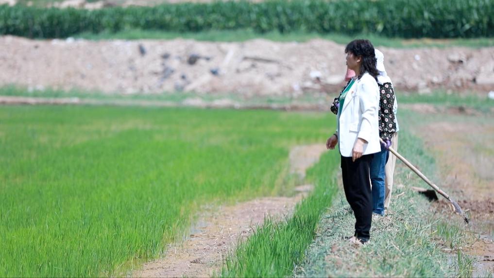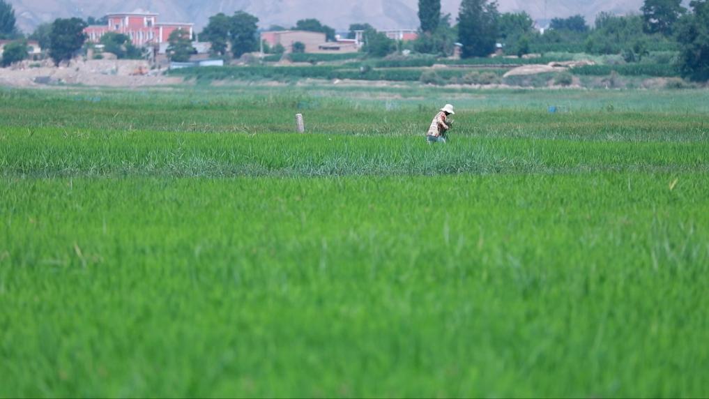 這里是甘肅省白銀市靖遠縣北灣鎮古城村的一處稻田。靖遠縣森茂種植養殖農民專業合作社負責人姚蘭與合作社成員一起來到田間地頭,整理田埂,查看秧苗長勢。