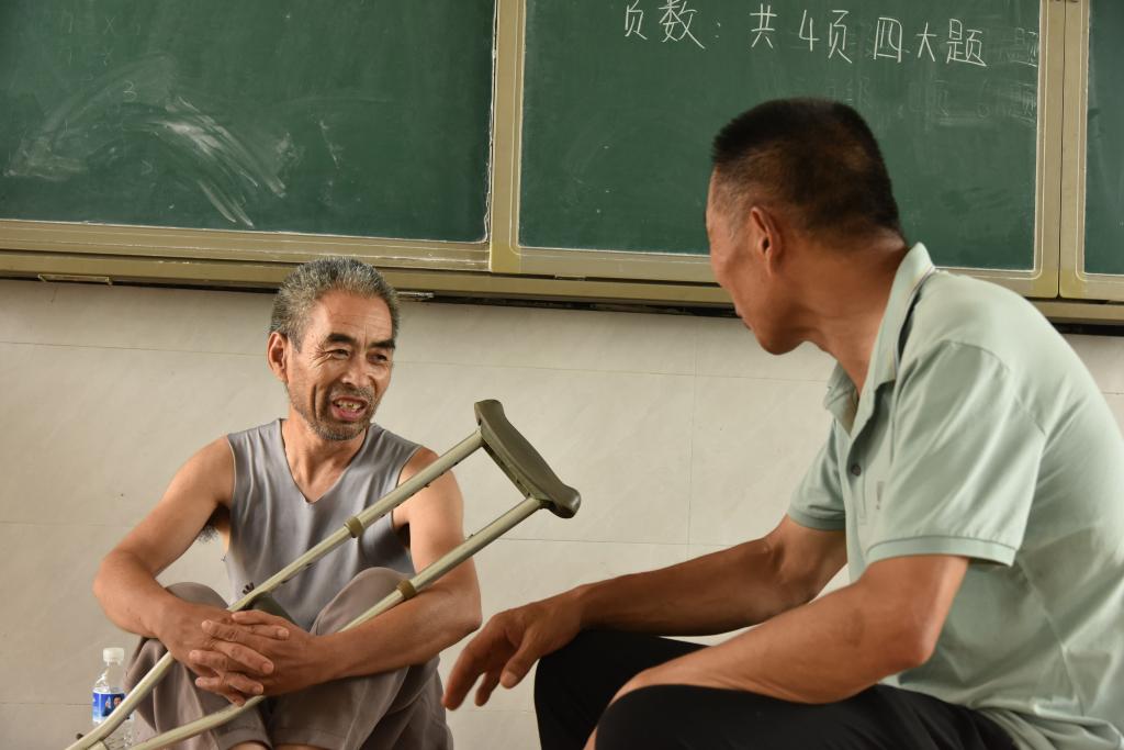 在新野縣閆坡小學安置點,前高廟鄉時樓村黨支部書記李新儉(右)正在與時樓村村民時新超(左)交流。(新野縣委宣傳部供圖)