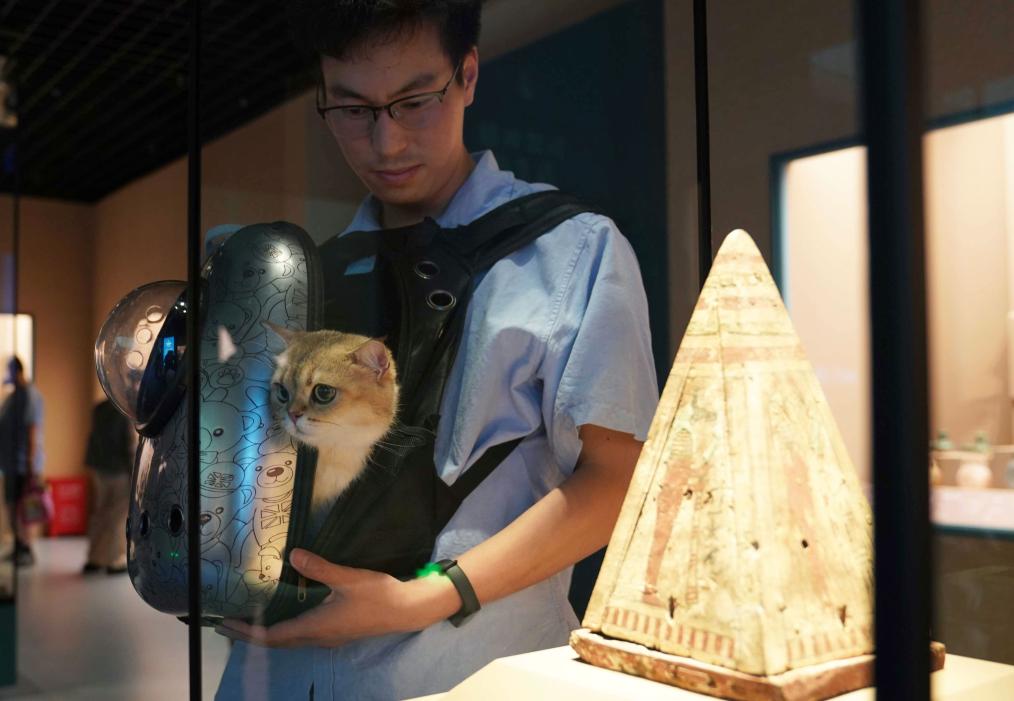7月27日,寵物貓與主人在上海博物館“金字塔之巔:古埃及文明大展”“薩卡拉的秘密”展區內觀展。新華社發(陳浩明攝)