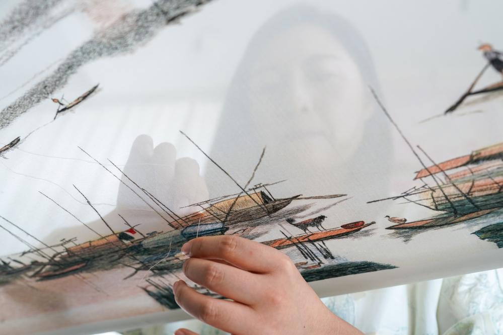 在蘇繡小鎮體驗館內,工作人員在進行蘇繡技藝展示。新華社記者 李博 攝