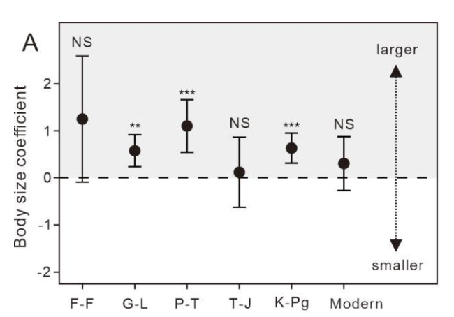 研究團隊收集了12701個樣本數據,涉及晚泥盆世弗拉斯期—法門期大滅絕事件、中—晚二疊世大滅絕事件、二疊紀末大滅絕事件、三疊紀末大滅絕事件、白堊紀末大滅絕事件,結果發現有孔蟲表現出明顯的體型依賴性,體型較大的有孔蟲在過去的滅絕事件中更容易滅絕。