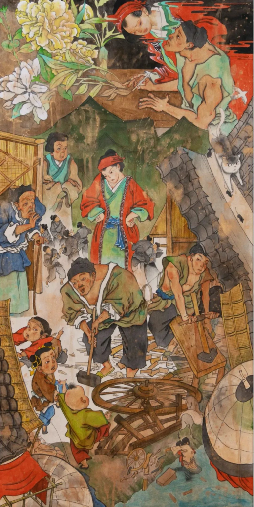 《被家暴的木匠》是陳漢煜“清明上河圖小人物的故事”這一繪畫系列中獲贊最多的作品之一。細節之處的共情力,是陳漢煜視頻的“核心競爭力”?!侗患冶┑哪窘场愤@個故事的靈感,源自于北宋時期女性地位較高,很多名人“懼內”的現象。陳漢煜說:“包括《夢溪筆談》作者沈括、蘇軾好友陳季常等人,都有‘怕老婆’的典故?!薄侗患冶┑哪窘场返闹魅斯畲髩驯臼倾昃┯忻牡窕窘?,一次意外跌落汴河,落下了驚風手抖的毛病。他的夫人何東詩(化用自典故“河東獅吼”)為了幫他保住一家的生計,便謊作家暴者,讓人誤以為李大壯手抖是因為被家暴,而非病癥,就此留住了家里的木匠生意。直到何東詩病逝,李大壯宣布不再雕花,這一真相才被眾人得知。