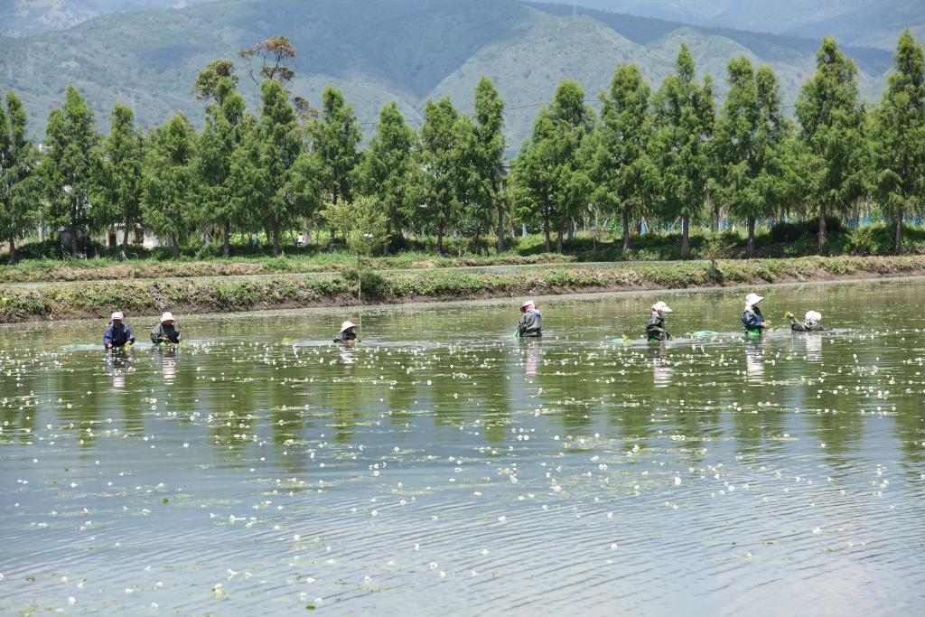 8月21日,洱源縣右所鎮松曲村的村民們正在采收海菜花。新華社記者 劉思遠 攝