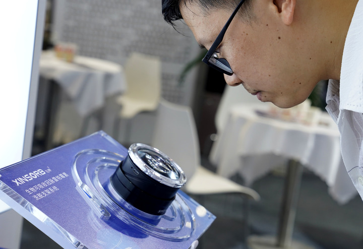 第二十三屆中國國際工業博覽會上,觀眾在復旦大學展臺通過放大鏡參觀XINSORB生物可降解心臟支架。