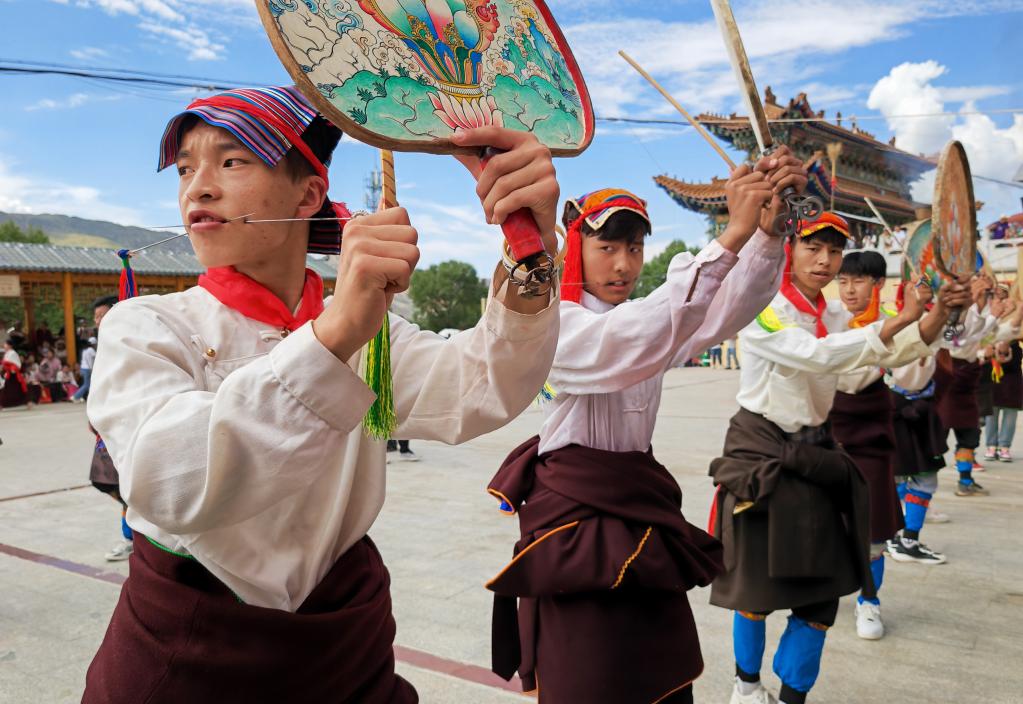 同仁市保安鎮下莊村,上著口釬的藏族青年在表演祈福舞蹈。新華社記者 柳澤興 攝