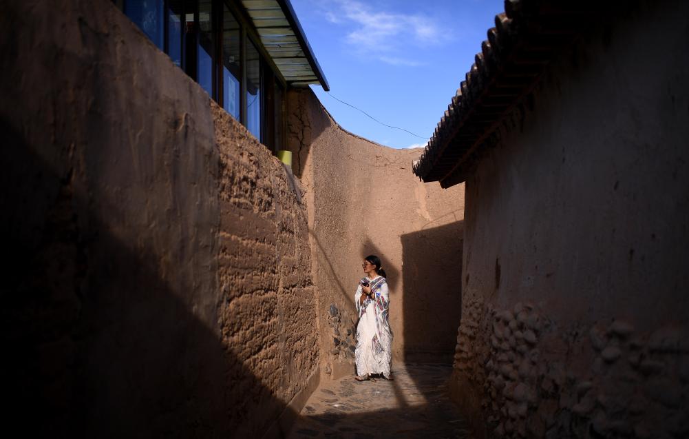 一名游客在同仁市郭麻日村郭麻日古堡內游玩。新華社記者 張宏祥 攝