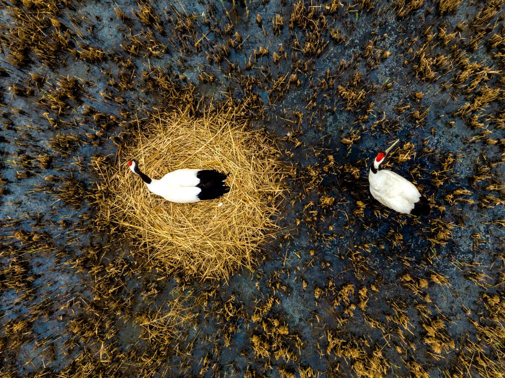 2023年4月14日,丹頂鶴成鳥在永遠角濕地里輪流孵蛋。新華社發(李國穎攝)