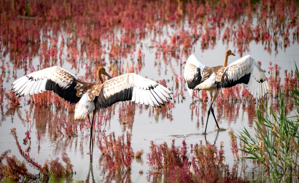 更為喜悅的是,2023年兩只活潑可愛的丹頂鶴寶寶在這片充滿生機的濕地中誕生。不僅令當地攝影愛好者和市民為之著迷,更是吸引了無數游客慕名而來。