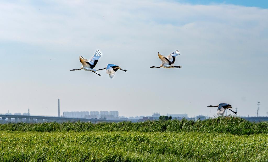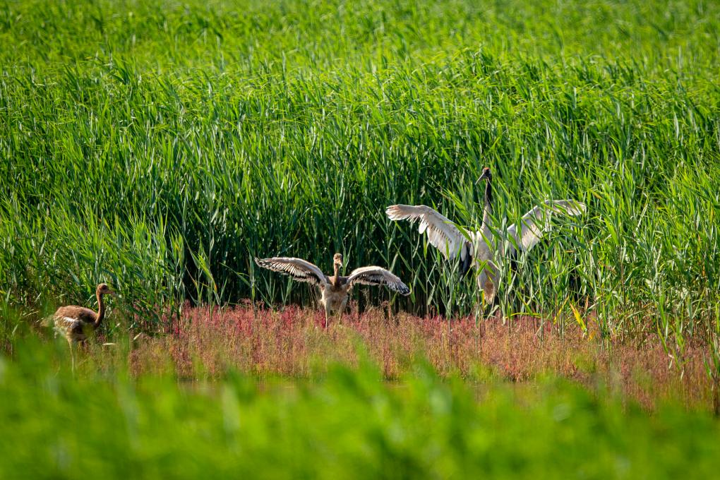 2023年6月18日,丹頂鶴成鳥帶著兩個寶寶在永遠角濕地里練習飛翔。新華社發(李國穎攝)