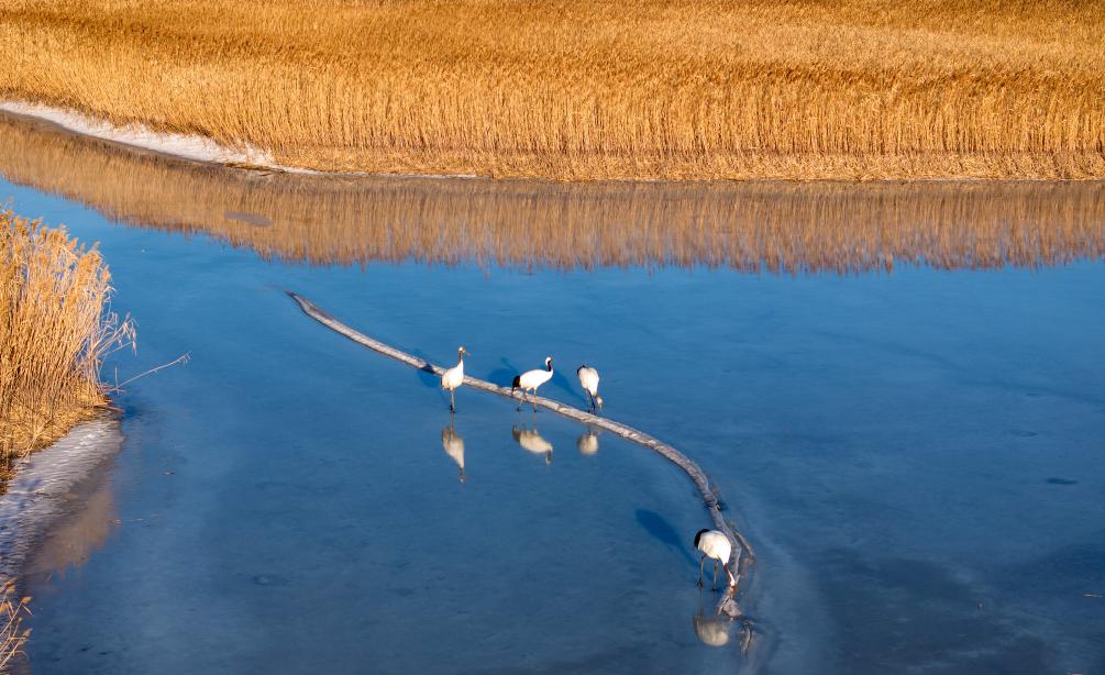 2024年1月11日,丹頂鶴一家四口在冬季的永遠角濕地里覓食。新華社發(李國穎攝)