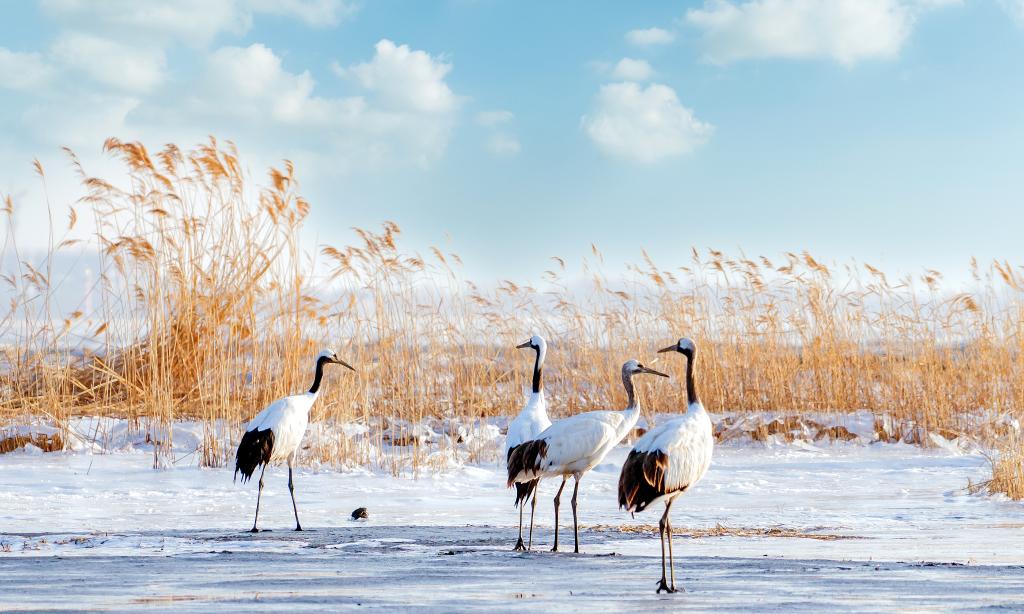 2024年2月8日,丹頂鶴一家四口在冬季的永遠角濕地里覓食。新華社發(李國穎攝)