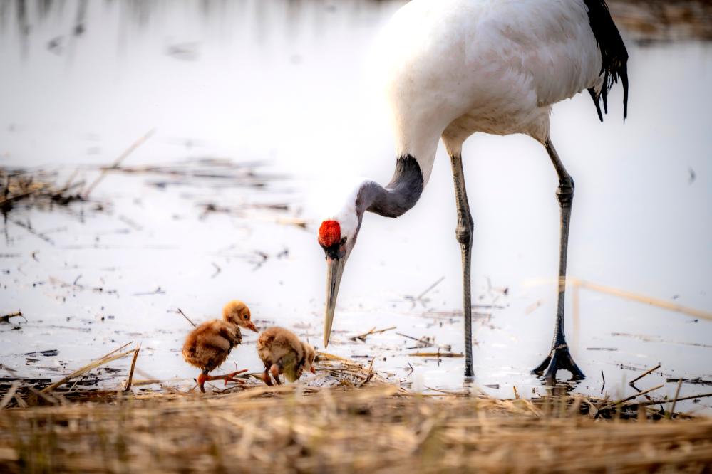 2023年4月16日,丹頂鶴成鳥帶著兩個寶寶在永遠角濕地里覓食。新華社發(李國穎攝)