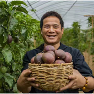 在陜西省西安市高陵區通遠街道何村種植百香果的農民潘學忠展示收獲的百香果。(新華社發)