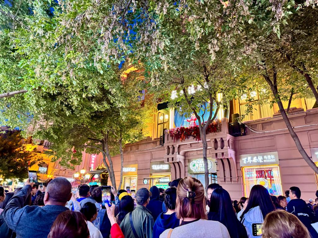 市民和游客在哈爾濱中央大街游玩。新華社記者 劉赫垚 攝