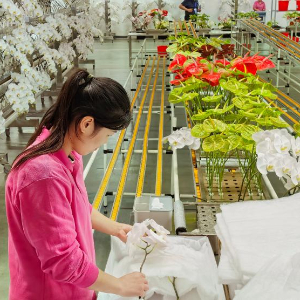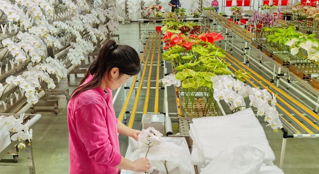 位于臨沂市蘭陵縣的山東新格林智慧農業產業園內,附近村莊的村民正在打包鮮切蝴蝶蘭。新華社記者 葉婧 攝
