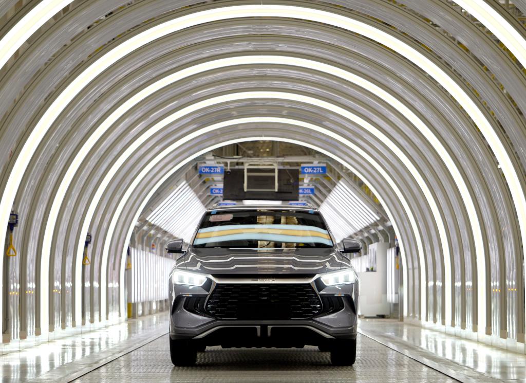 4月25日拍攝的鄭州航空港區比亞迪總裝工廠新能源汽車“宋Pro”生產線。新華社記者 李嘉南 攝
