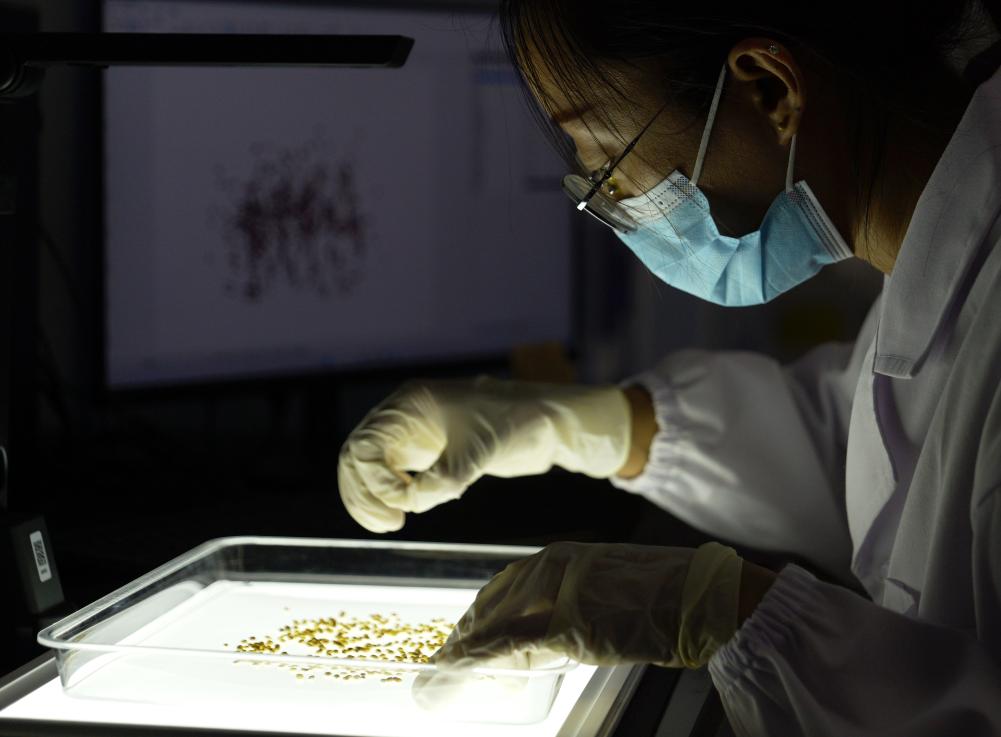 5月16日,中國農科院中原研究中心科研人員在中原農谷實驗室內進行高粱樣品篩選。新華社記者 李嘉南 攝