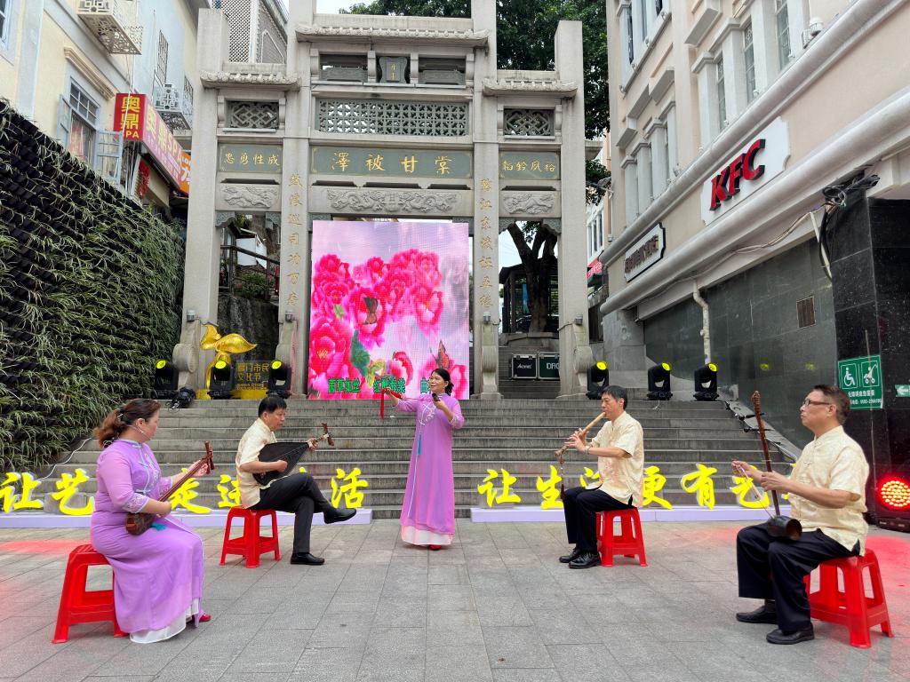 新華社廈門10月5日電(記者付敏)“南音太美妙了,婉轉悠揚,韻味十足?!边@個國慶假期,在廈門中山路的“澤被甘棠”石牌坊下,一場南音表演讓來自湖南的劉麗婷感受到了閩南地區非遺文化的魅力。