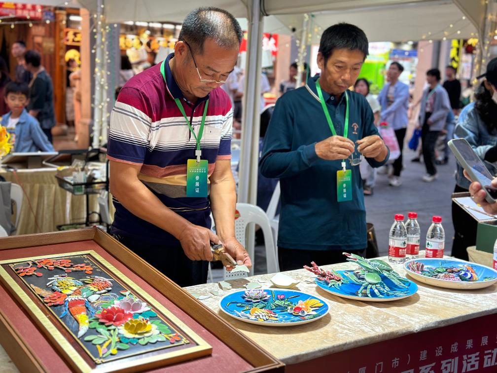 10月4日,在廈門中山路的非遺攤位上,剪瓷雕非遺傳承人王國強(左)現場進行剪瓷雕展示。新華社記者 付敏攝