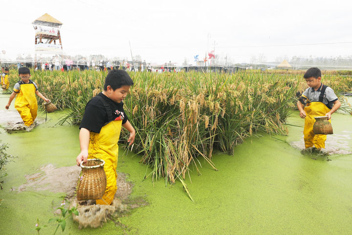10月3日,孩子們在浙江省義烏市赤岸鎮一處稻魚共生的稻田里捉魚。新華社發(龔獻明 攝)