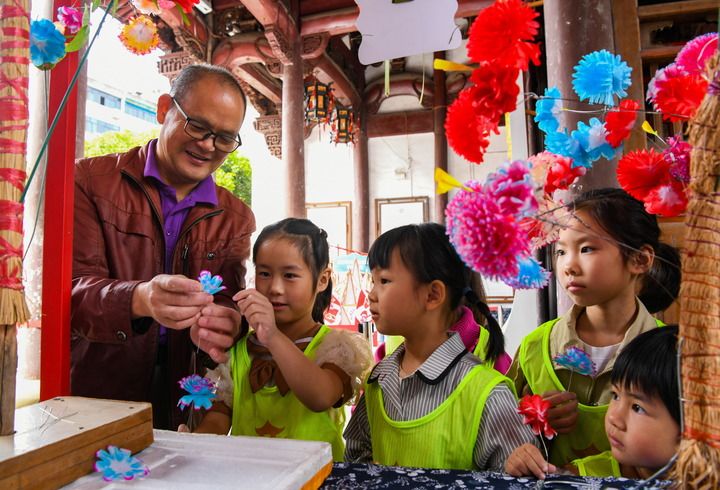 10月4日,在浙江省金華府城隍廟,小朋友觀看手工藝人制作紙花。新華社發(時寬兵 攝)