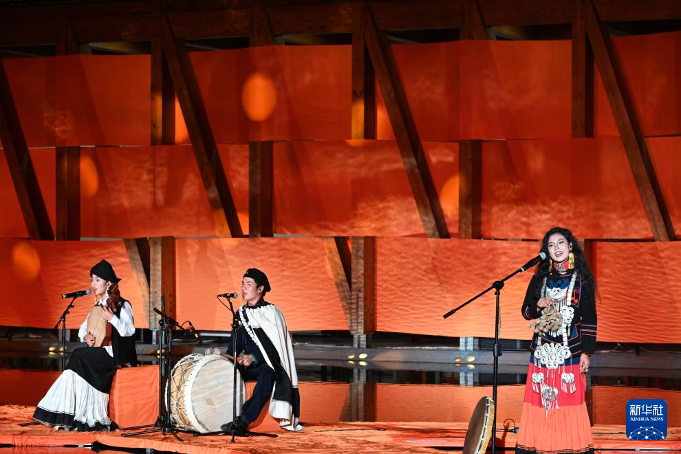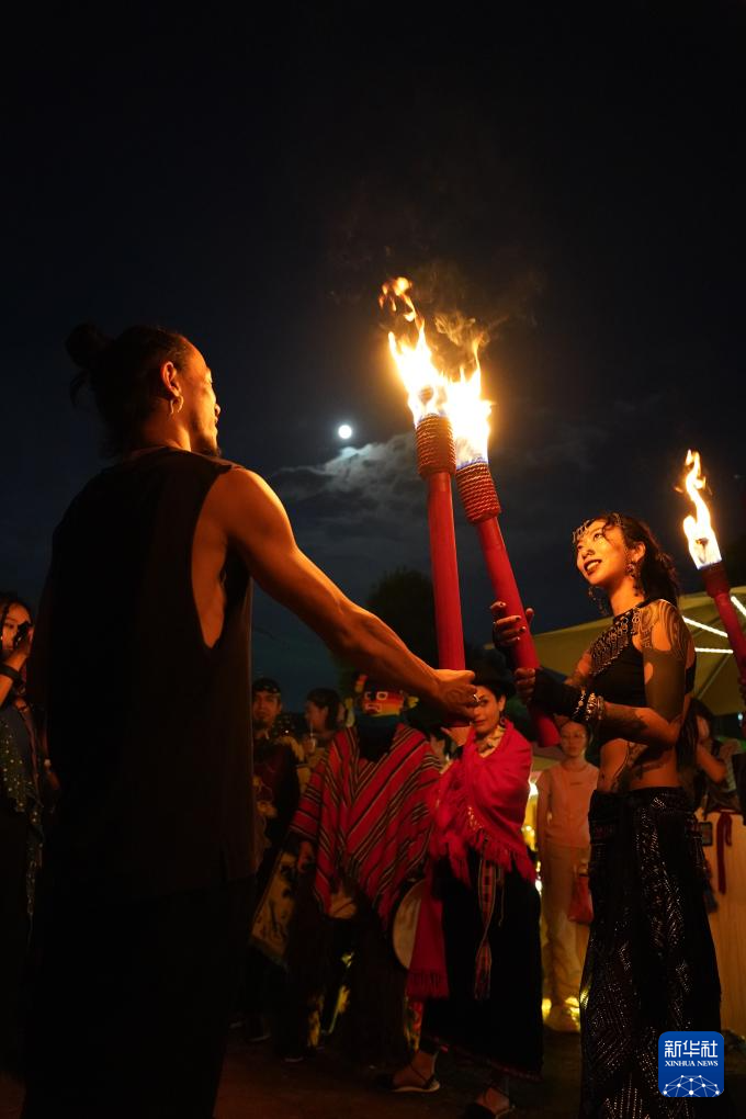 火樹銀花不夜天。手舉火把、身著民族服飾的表演者排著一列長隊,在人群中踏歌而來。