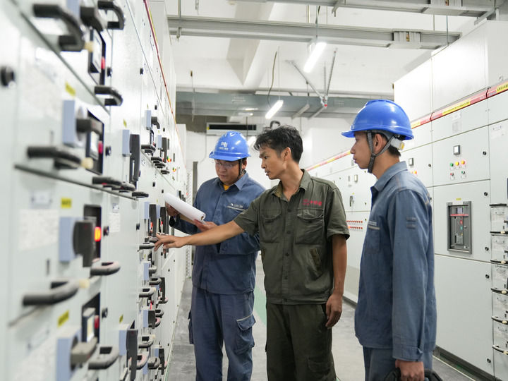9月6日,南方電網廣西北海供電局工作人員在北海市人民醫院銀灘分院檢查配電房設施,溝通防護措施。(陽文志 攝)
