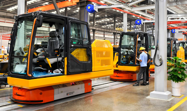 在廣西柳州市柳工挖掘機智慧工廠拍攝的有軌制導車輛裝配線(5月10日攝)。新華社記者 金皓原 攝