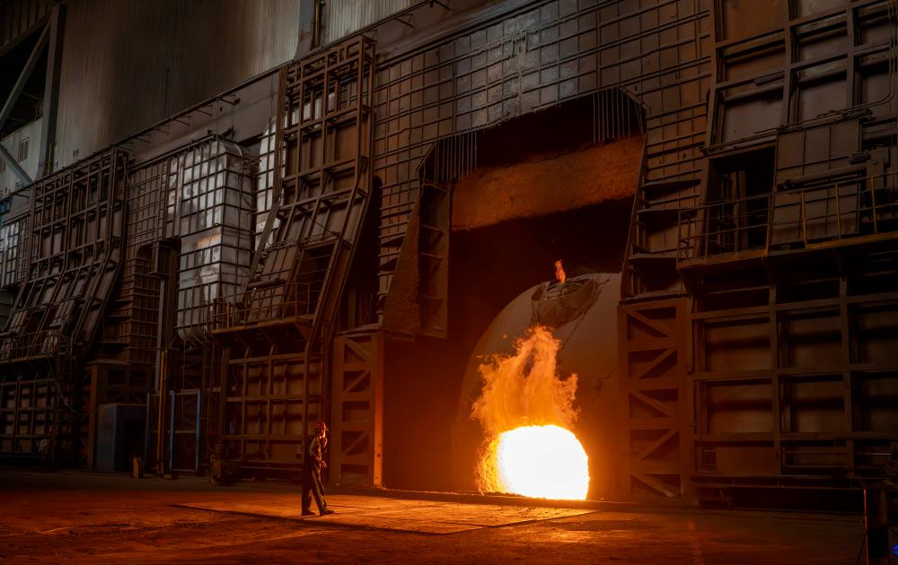 11月12日,在煉鋼廠煉鋼作業區,工作人員在查看轉爐內部濺渣情況。