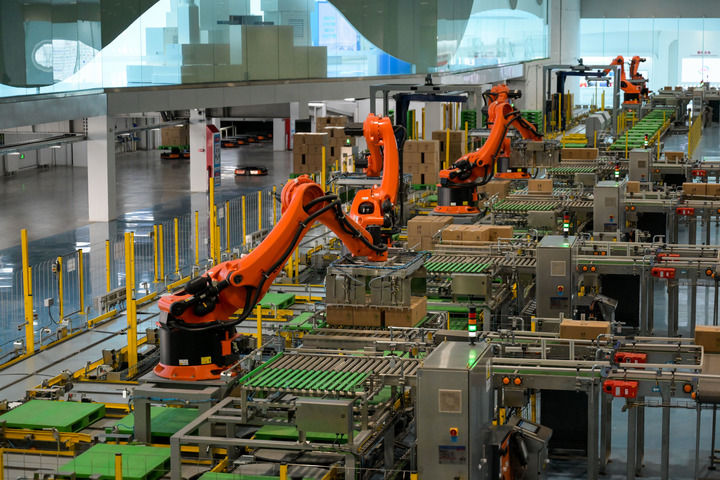 在呼和浩特市伊利現代智慧健康谷液態奶全球智造標桿基地,機器人在碼放裝箱的乳制品。 新華社記者李志鵬 攝