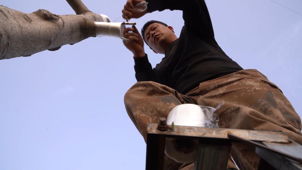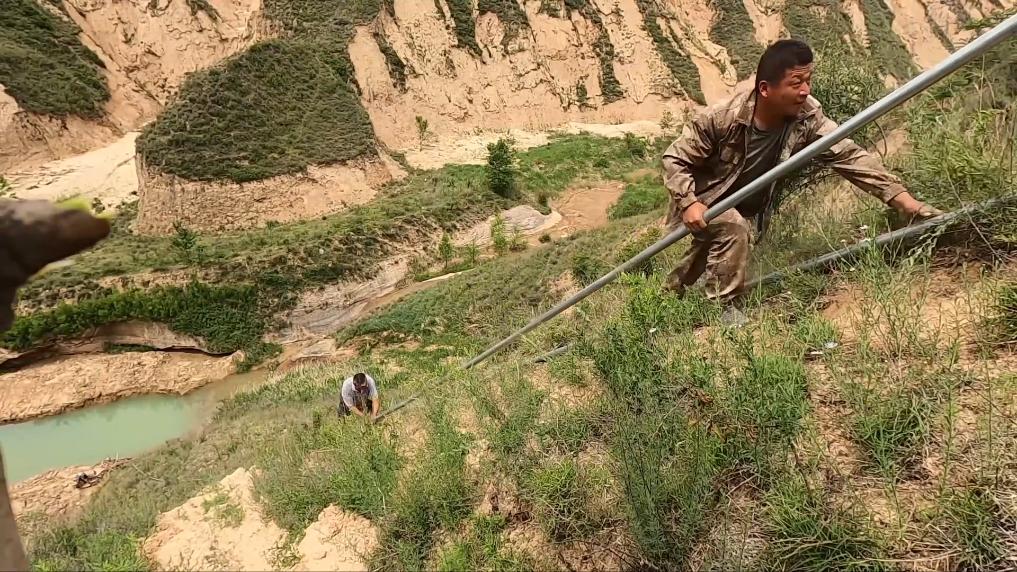 2014年,退伍后的馮元明回到山西省大寧縣白村種蘋果,黃土高原多干旱,他不得不從2公里外的深溝里往果園引水。
