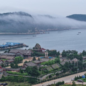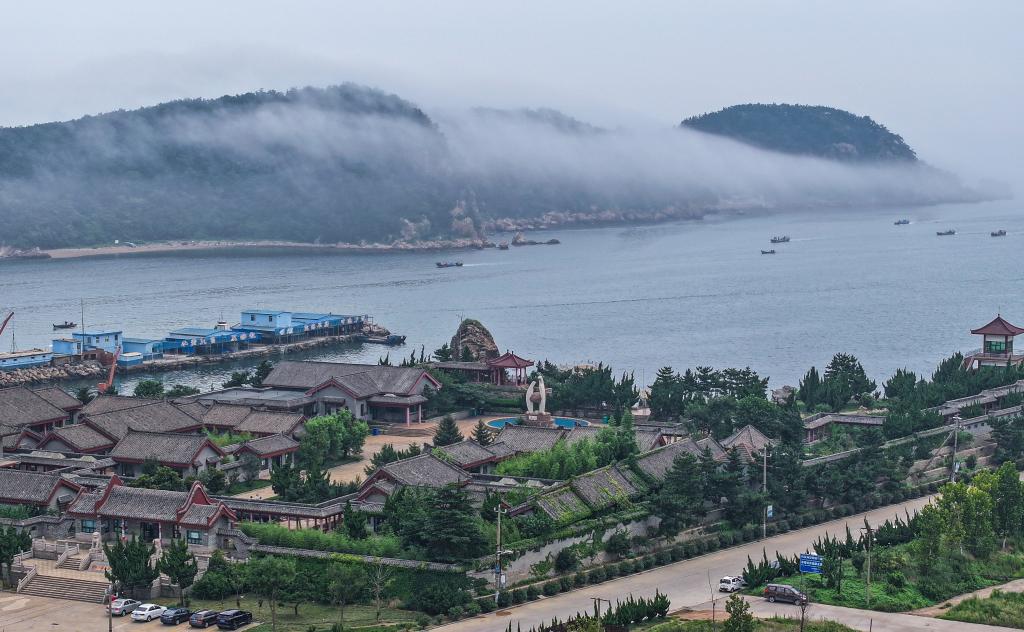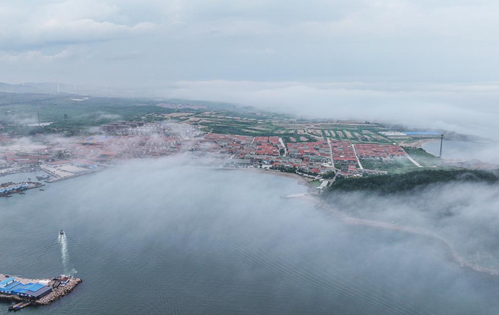 2024年8月7日,平流霧下的山東省榮成市俚島鎮煙墩角村(無人機照片)。 新華社發(李信君 攝)
