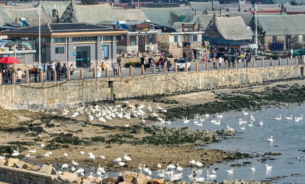 新華社濟南11月27日電(記者李志浩、馮媛媛)在威海海濱的煙墩角村,海浪輕輕,成群的大天鵝游弋、覓食,海草房靜立岸上,游人穿梭。
