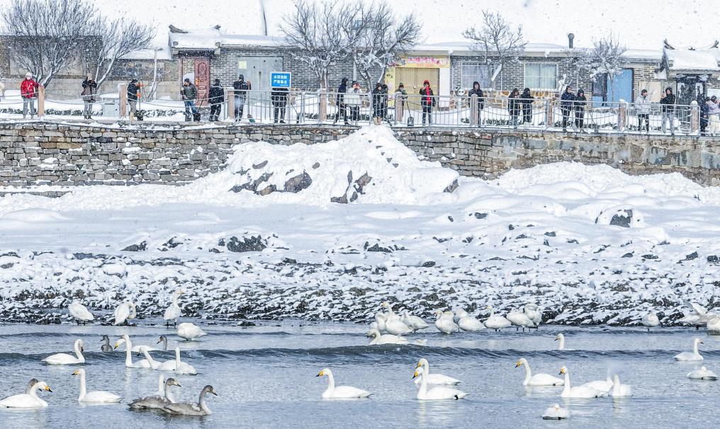 2023年12月17日,游客在煙墩角村近距離觀賞大天鵝。新華社記者 李志浩 攝
