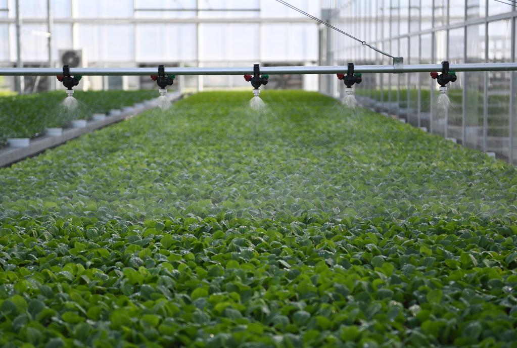 12月2日,在謝徑安·傳化農創村植物科學中心里,自動噴灌系統在數字種苗工廠內灌溉育苗。新華社記者 盧哲 攝