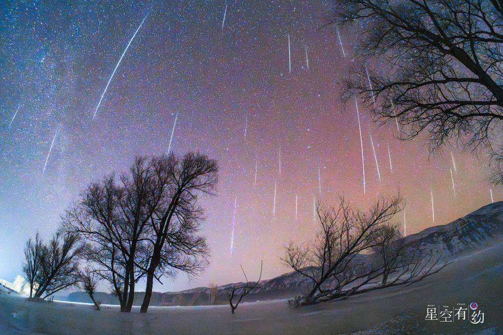 2023年12月13日夜晚至14日凌晨在新疆阿勒泰拍攝的雙子座流星雨(多張疊加)。(李碩攝,星聯CSVA供圖)