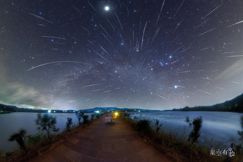 2023年12月13日夜晚至14日凌晨在云南瀘沽湖拍攝的雙子座流星雨(多張疊加)。(白茂霖攝,星聯CSVA供圖)